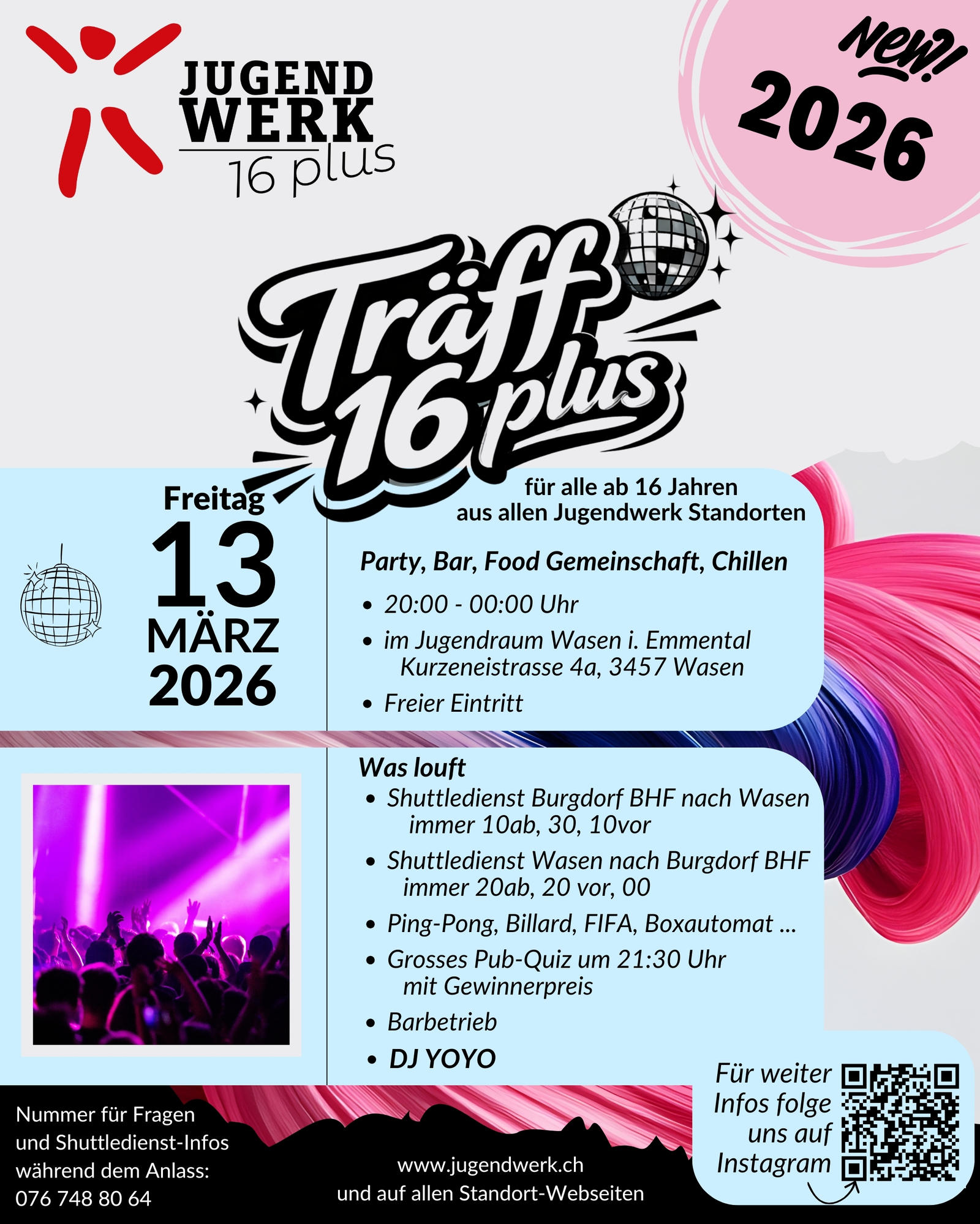 Bei Fragen oder Anliegen erreicht ihr uns telefonisch unter 076 730 26 86 (Mi.–Fr.) oder per Mail nbipp@jugendwerk.ch